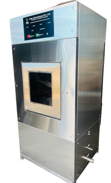 Vida-Automatic Sensor Operated Door - Washer Disinfector with Dryer Double Door Fully Automatic with Delta PLC and Touch Screen with thermal printer with Visible toughened glass for both door, volume 350liters, made out of complete SS304